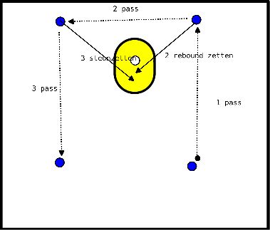 • Speler 3 staat op 1,5 meter van de pylon komt in lopen voor druk op het schot. Na elke 2 schoten wissel je met de verdediger