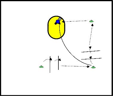 - Bal wordt vanuit de voorzijde van de paal gegooid naar de wegtrekkende speler, daarna schot.