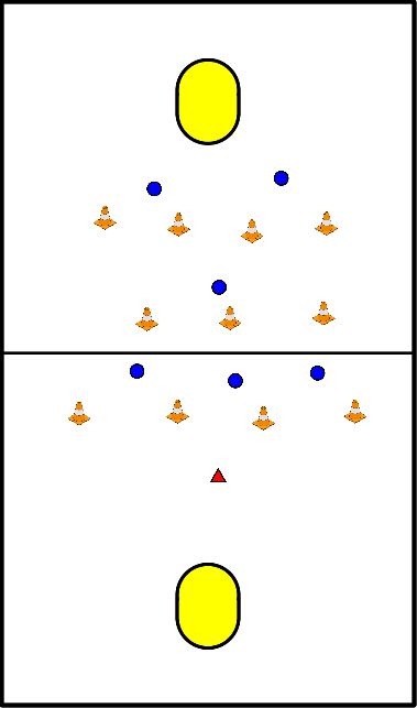 - Deel f: Zoals b, maar de loper neemt uitwijkballetjes. De aangever vangt het schot af en probeert daarna zelf te scoren. Wie scoort als eerste 5 keer?