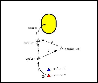 - Deel e: Zoals b, maar met een overneemsituatie. De loper speelt de bal terug naar de aangever die bij de paal is weggestart. Wie maakt het eerst 5 doelpunten?