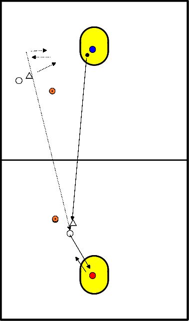 - Als de aanvaller de bal goed ontvangt zonder dat de verdediger deze onderschept, komt er een extra verdediger bij.