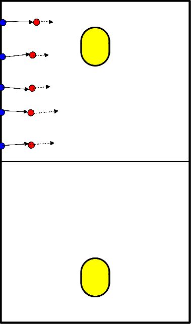 - Een aanvaller en verdediger staan beiden in een cirkel van 3 meter van hoedjes, waarbij de verdediger zoveel mogelijk probeert te voorkomen dat de aanvaller kan uitstappen naar de aangeef positie