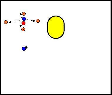 - De aanvallers om de cirkel heen spelen over naar elkaar en proberen daarmee de verdediger op het verkeerde been te krijgen