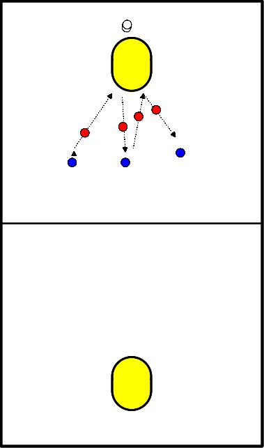 - Voorin staat een speler met bal, en ze speelt de bal naar rood of blauw. Ze kiest zelf wie, het is aan de aanvallers om op te letten!