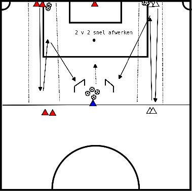 - Als de verdediger de bal verovert zet hij de aanval in op de andere 2 goals en verdedigt de aanvaller.