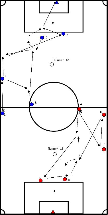 - Ondertussen loopt A door het rechter poortje naar het midden, net voor het strafschopgebied.