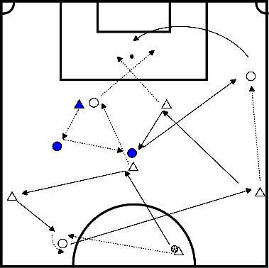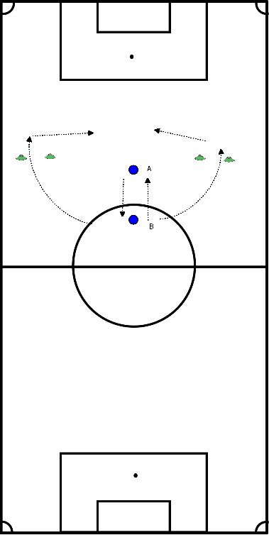 - Speler B speelt een bal in naar A die afwerkt op doel.