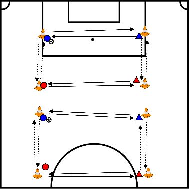 - Rood dribbelt het vak in en speelt de bal naar Blauw.
