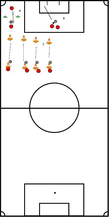 - Na inspelen moet de speler doorlopen om de bal te vragen tussen de pionnen.