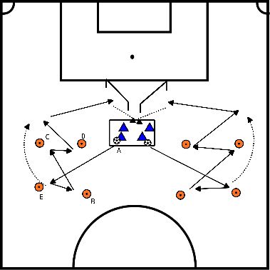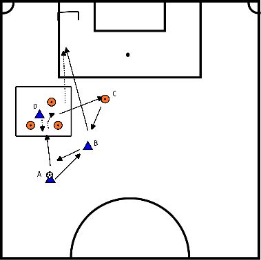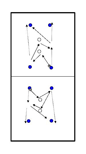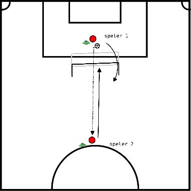 - Speler 1 speelt de bal door het vak heen naar de overkant en sluit dan aan bij een speler aan de zijkant.
