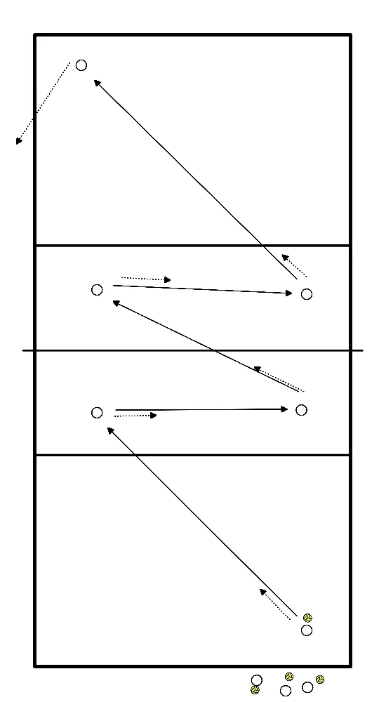 - Verwerk twee ballen van cross-court slagen, één simulerend voor perimeterverdediging en de andere voor rotatieverdediging.