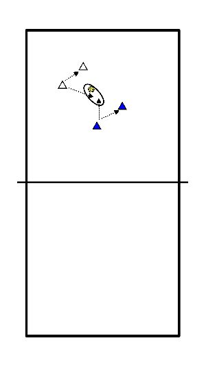• Vorm een groep van drie spelers. Eén speler staat bij het net, de andere twee staan aan beide kanten achterin het veld.