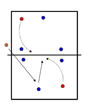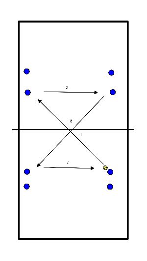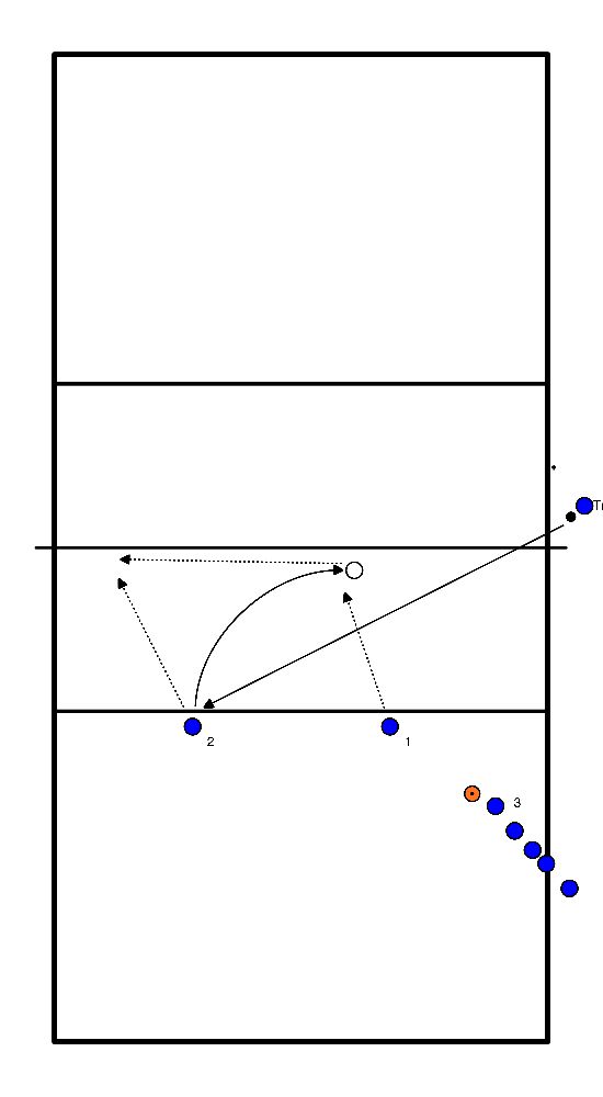- Speler 1 loopt naar deze positie en geeft een onderhandse setup op buiten waar speler 2 aanvalt.