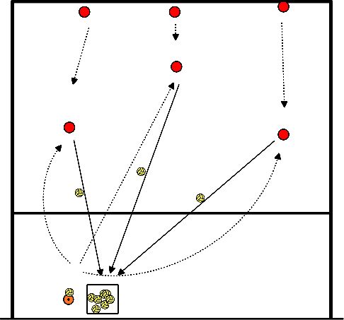 Treinador a enviar bolas mortas. 3 pessoas em 1-6-5 para receber as bolas que vêm do treinador.