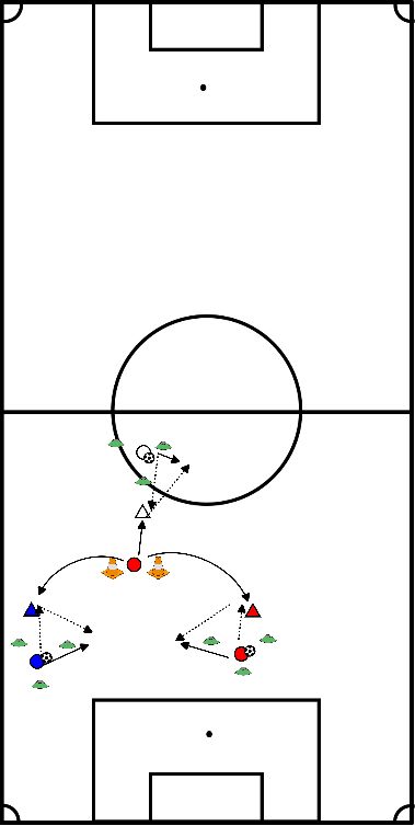 Exercício de reação onde o jogador do meio vai a um dos cones tabelar ao sinal do treinador (que grita a cor do cone):