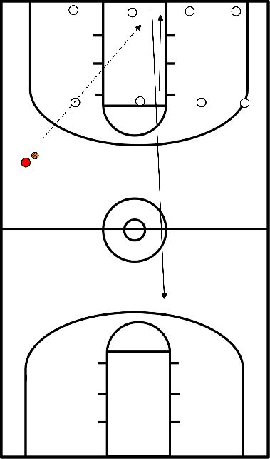 - O jogador na linha de fundo passa com força para o jogador que está à volta da linha dos 3 pontos