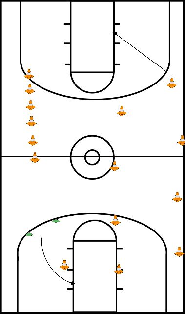 - Começar a driblar em direção ao canto do balde, fazer inversão de marcha e depois fazer um lay-up