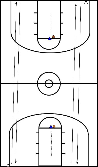 - Após o lançamento, apanham o seu próprio ressalto e fazem um passe de saída para o jogador que está à espera na linha lateral