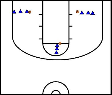 - 2 jogadores ao nível do prolongamento do quadrado de lance livre de cada lado do campo