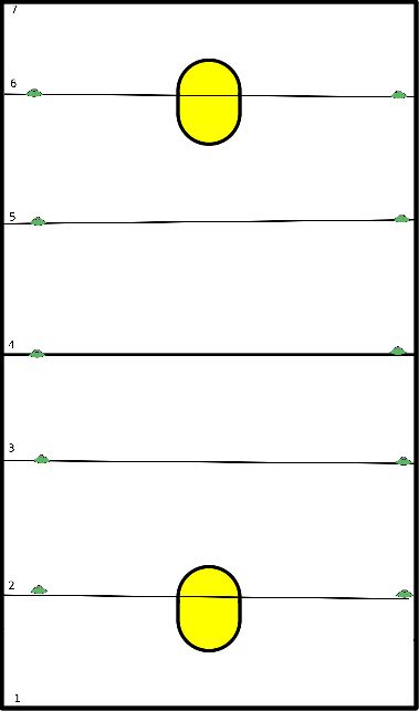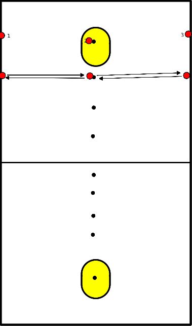 Em pares de 3 num poste. O jogador 1 coloca-se debaixo do poste com a bola. O jogador 2 começa o exercício, depois de o jogador 2 ter feito o exercício troca com o ponteiro. O jogador 3 começa o exercício, etc. Para este exercício precisamos de 4 chapéus, um poste, uma bola e a escada de corda.