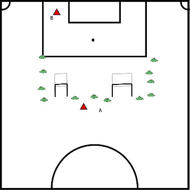 - A equipa A joga contra a equipa B e tem de marcar golo em balizas pequenas.