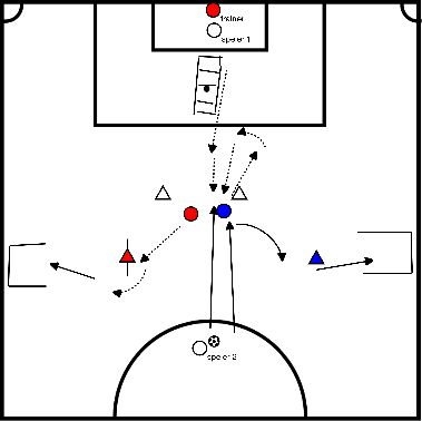 - Após a finalização, o defensor torna-se guarda-redes, o atacante torna-se defensor e o guarda-redes pega na bola e junta-se para praticar