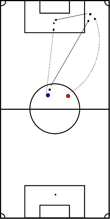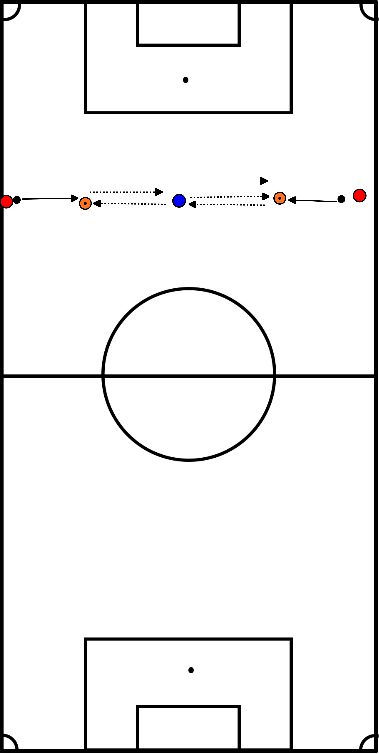 - O jogador 2 desloca-se lateralmente (de frente para o jogador 1) para o stick a, contorna o stick e recebe a bola no meio do jogador 1.