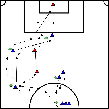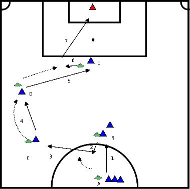 - O jogador que deu o passe em profundidade vai para a posição de finalização.