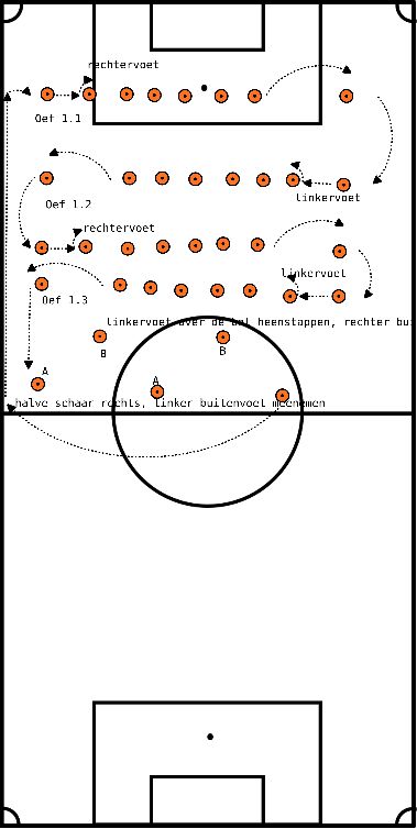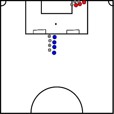 - A bola deve passar por todos os cones antes que o jogador que a recebe possa aceitá-la e driblar para a outra posição.