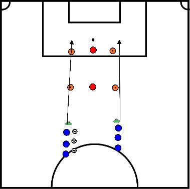 - O jogador que passou pelos cones junta-se ao jogador que deu o passe em profundidade.