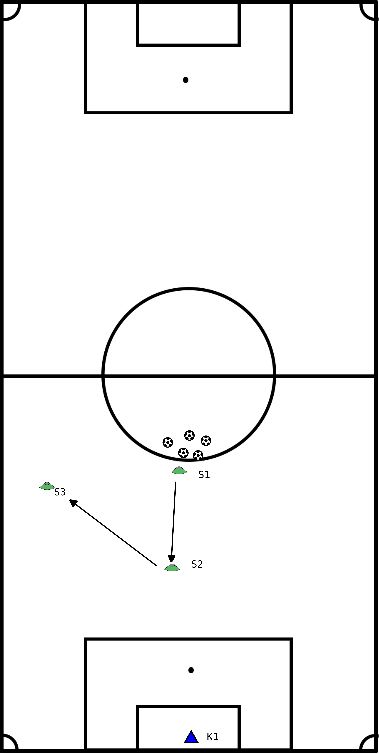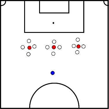 - A bola deve passar por todos os cones antes que o jogador que a recebe possa aceitá-la e driblar para a outra posição.