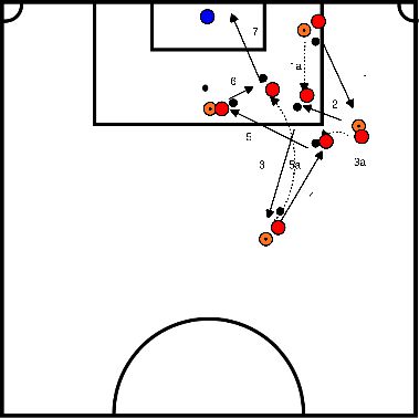 • O jogador 2 recebe a bola e depois passa uma bola longa pelo ar para o jogador 3.