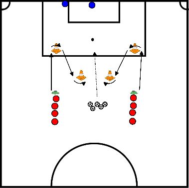• O jogador que finalizou busca a bola e junta-se à parte de trás dos jogadores que precisam passar pelos cones.