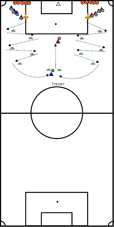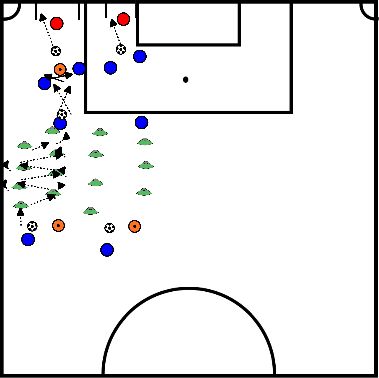 - Após o 1x1, o jogador azul recebe um novo passe do jogador na fila vermelha.