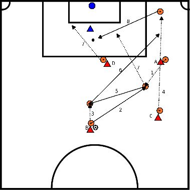 - Jogador B recebe a bola do jogador A, faz uma combinação direta com o jogador C e desloca-se para o lugar do jogador C.