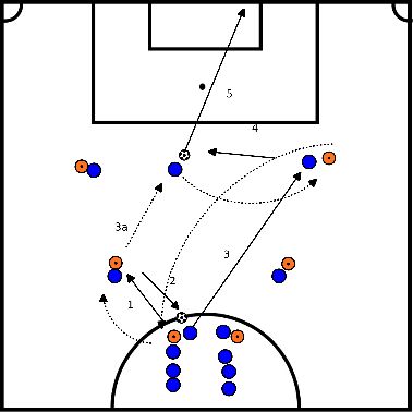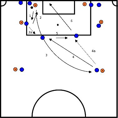 - Jogador 6 vem ao encontro da bola e o jogador 5 decide, ao passar, se quer a bola à esquerda ou à direita.