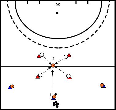 - O atacante azul pega na bola e joga um 1 contra 1 com o defesa azul no quadrado.