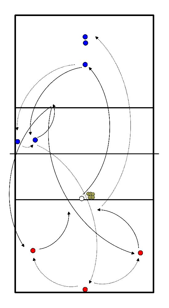 - 2 jogadores na rede fazem uma ação de bloqueio e correm de volta para o campo