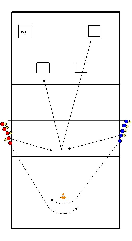 - Os jogadores com bola jogam para o jogador do lado oposto, este joga a bola de volta com cuidado e junta-se à outra fila, baralhando.