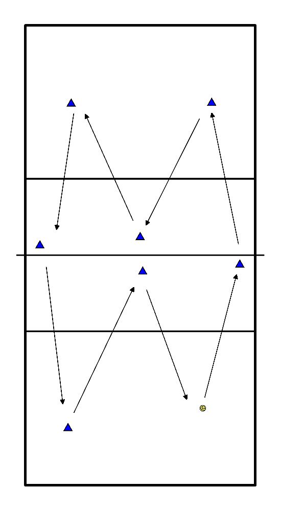 - Passar para o atacante -P4- e, nesse momento, os passadores deslocam-se para P1 e P6.