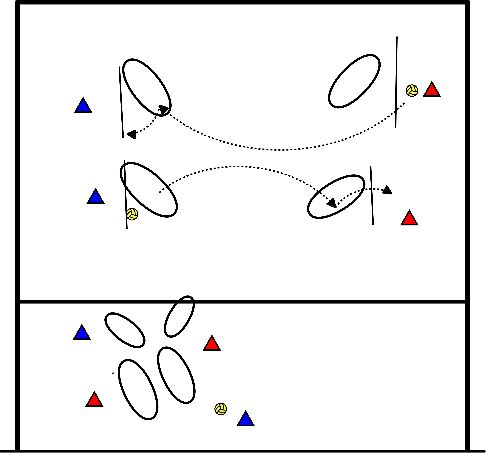 - Os jogadores deitam-se de barriga para baixo no chão. O jogador da retaguarda salta por cima de cada jogador. No final, vira-se e atira a bola para o jogador de trás. E mais uma vez.