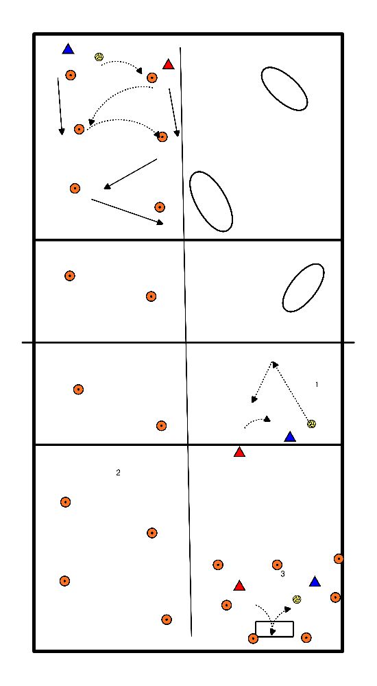 - Os jogadores deitam-se de barriga para baixo no chão. O jogador de trás salta por cima de cada jogador. No final, vira-se e lança a bola para o jogador de trás por baixo dos outros jogadores que formaram uma ponte nesse momento.