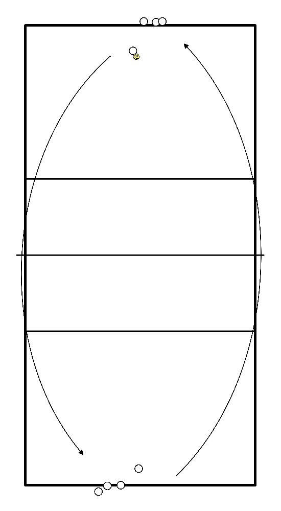 LADO A: 2 pessoas com bola na linha de 4 metros, posição 5 - 1 sem bola na linha de 4 metros, posição 1
