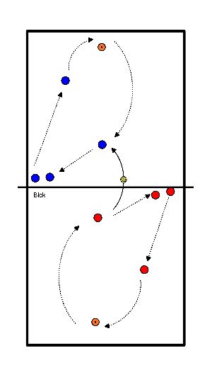 Prolongamento: Alguém pode também lançar uma bola do outro lado da rede. A bloqueia a bola e depois defende a bola de B.