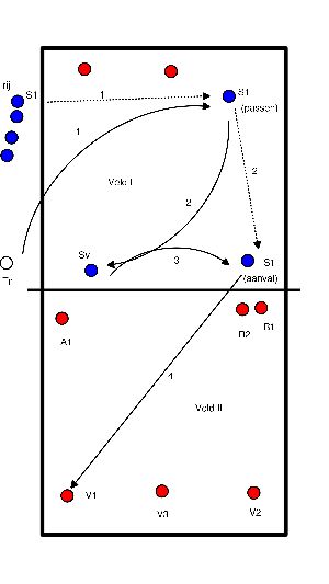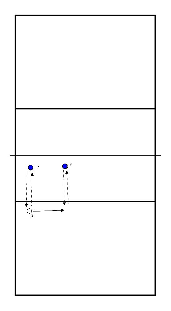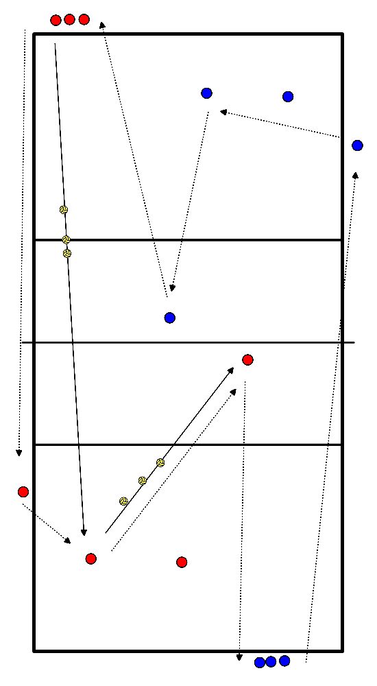 - Junta-se um atacante que tem de jogar a bola do armador sobre a rede.
