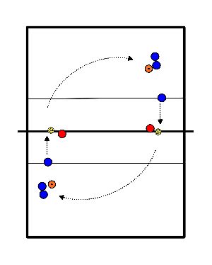 - 1 jogador na pos. 5 atira a bola para a pos. 3 (SV).